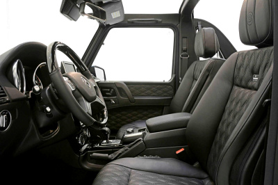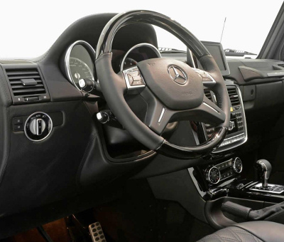 Интерьер внедорожника также оформлен в черной цветовой гамме. Сиденья модели обиты перфорированной кожей, поверхности украшены черным рояльным лаком и карбоновыми вставками, а на смену прежнему рулевому колесу пришел более спортивный вариант. Помимо этого, тюнеры оставили в салоне G500 Convertible множество значков и эмблем, напоминающих о проделанной ими работе.