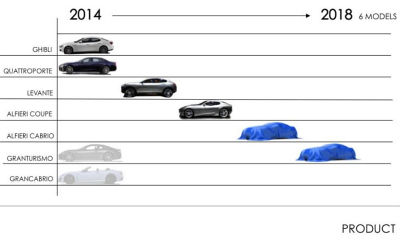 Первой новинкой Maserati станет кроссовер Levante, предвестником которого был концепт-кар Kubang 2011 года. Полноприводный автомобиль будет выпущен в 2015 году. В его моторную линейку войдут бензиновый V6 мощностью 350 и 425 лошадиных сил, бензиновый V8 с отдачей более 560 лошадиных сил, а также дизельный двигатель в трех вариантах мощности (250, 275 и 340 лошадиных сил).