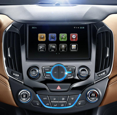 На фото запечатлен седан с обивкой салона коричневой кожей, отделкой черным «рояльным лаком» и хромированными акцентами. Трехспицевое рулевое колесо также обтянуто кожей, а интерьер подсвечен «ледяным синим» светом. На центральной консоли «в форме бабочки» появился восьмидюймовый экран информационно-развлекательной системы MyLink II. В Chevrolet утверждают, что управление системами автомобиля стало интуитивно понятным и простым.