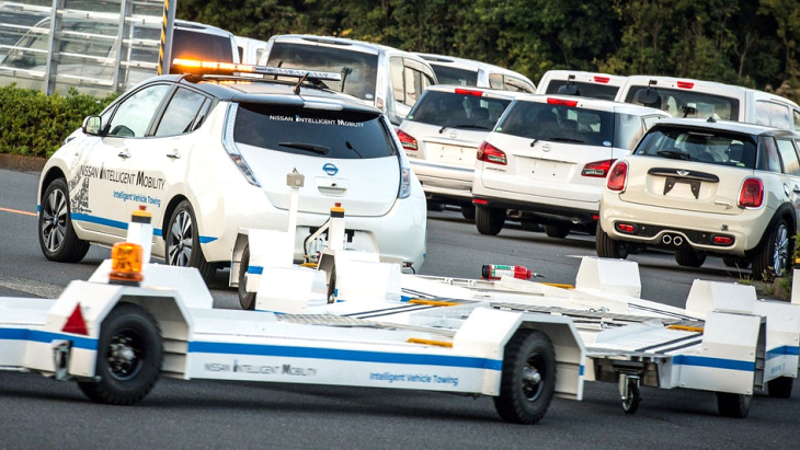 Nissan сообщает, что решил эту проблему при помощи «Интеллектуальной автомобильной системы транспортировки» (Intelligent Vehicle Transport). Фактически, новое решение представляет собой электрокар Leaf, буксирующий прицеп. Машина оснащена необходимым набором камер и сенсоров, чтобы не врезаться в стены и рабочих, и использует усиленную заднюю подвеску.