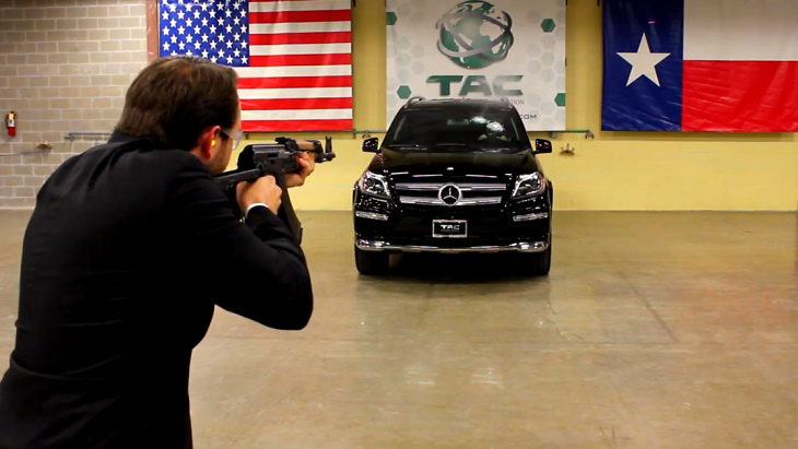 Техасская компания Texas Armoring Corporation (TAC) опубликовала видеоролик, демонстрирующий устойчивость ее лобового стекла для вседорожника Mercedes-Benz GL-Class против прямого обстрела из автомата AK-47 7,62-миллиметровыми патронами.